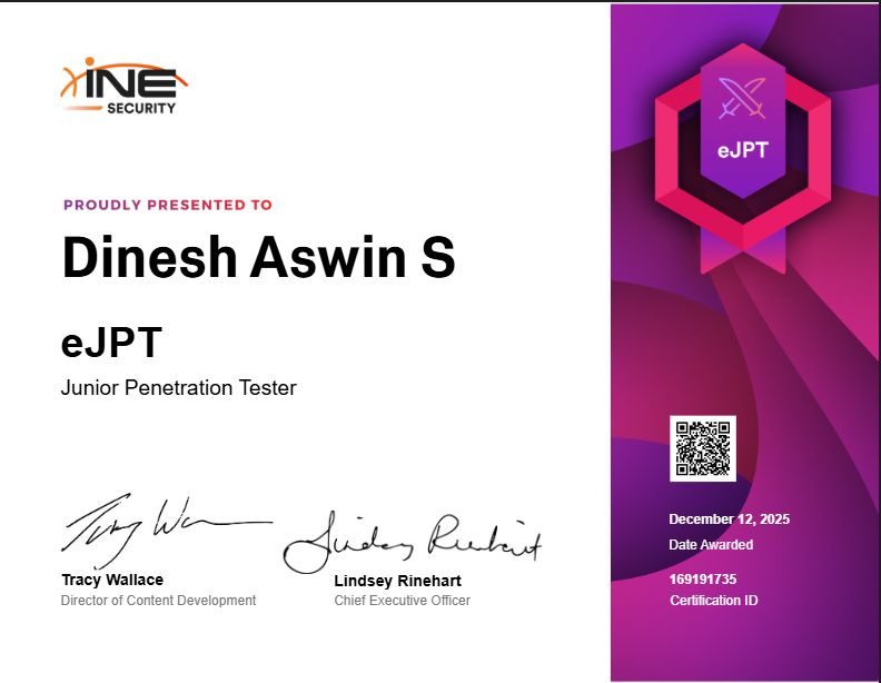 I’m Dinesh Aswin S, a Computer Science Engineering undergraduate with a strong passion for penetration testing and ethical hacking. I focus on identifying, exploiting, and understanding vulnerabilities in web applications to help improve their security. I have hands-on experience with CTF platforms like TryHackMe and VulnHub, where I regularly practice real-world attack scenarios. I’m proficient in Python, C++, Bash, JavaScript, and PowerShell, and I enjoy automating tasks and building custom scripts during assessments.