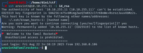 I downloaded the id_rsa file and set the appropriate permissions using the command chmod +x id_rsa. After that, I used the hint from Task 4 to find the username and then proceeded to log in to the SSH service.