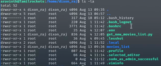 Now, moving on to Task 6, where we need to find a way to delete the pirated films. We found all the pirated movies inside the dixon_raj folder. However, we also noticed that our current user (aravindth) doesn't have the necessary permissions to delete the files.