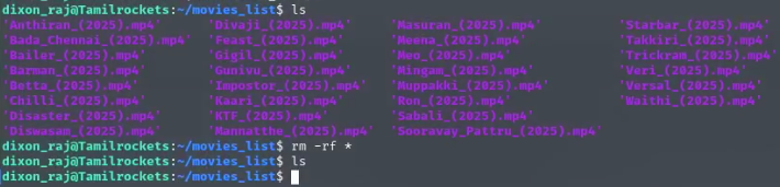 We can switch to the dixon_raj user using the su command. Then, we can navigate to the movies_list folder and delete all its contents.